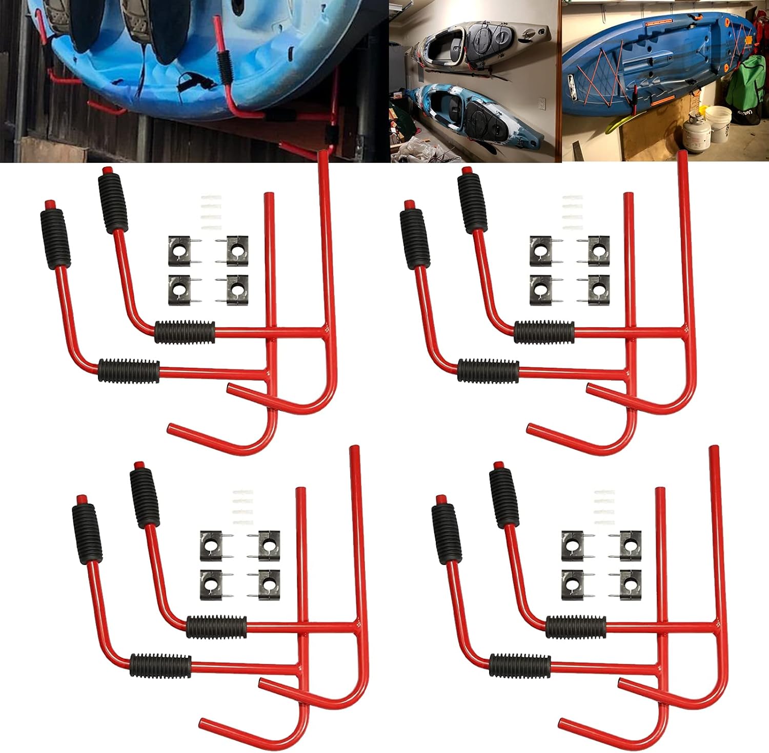 Kayak Wall Mount Storage Rack Ladder Surfboard Canoe Steel Folding Hanger Specification: Condition: 100% Brand New Color: Black or Red Material: Steel Total load capcity: 100 lbs (1 Pair) Size: Reference as picture Tube diameter: 19mm Net Weight(approx): 2.6 Lbs (1 Pair) Feature: Rubber pads protect the hull finish Steel construction Convenient installation Can be foldded to the side when not in use Each hanger rack with 2 PVC pipe sleeves Additional hooks offer more storage for paddles and accessories Package Include: Set of 4 Wall Mount Kayak Rack (Kayaks are not included) Installation accessories